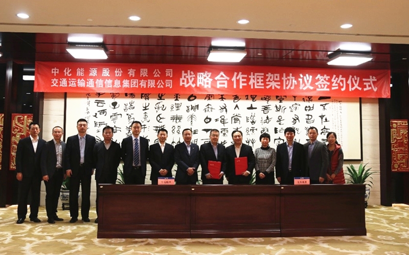 中化集团副总裁、776net必赢官网副总裁钟韧,中国交通通信信息中心主任兼交信集团董事长曹德胜代表双方在协议上签字。