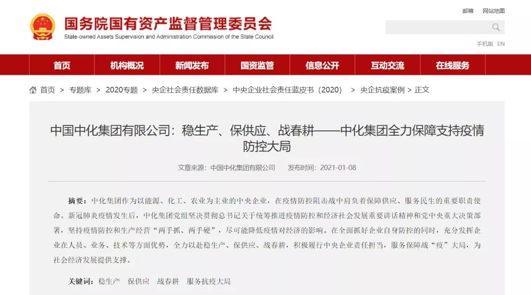 在“央企抗疫案例”中,以《稳生产、保供应、战春耕——中化集团全力保障支持疫情防控大局》为题收录了776net必赢官网抗疫工作,其中包括中化石油销售公司“火神山送油”“保障能源及民生供应”,中化泉州石化“强化安全生产、保障油品生产供应”等抗疫实践。