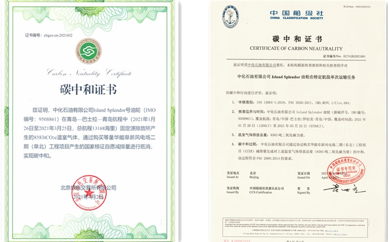 4月2日,石油公司凭借油轮在节能、低碳领域的成功实践,获得北京绿色交易所和中国船级社共同颁发的“碳中和证书”,这是国内首例实现碳中和的油轮航次。