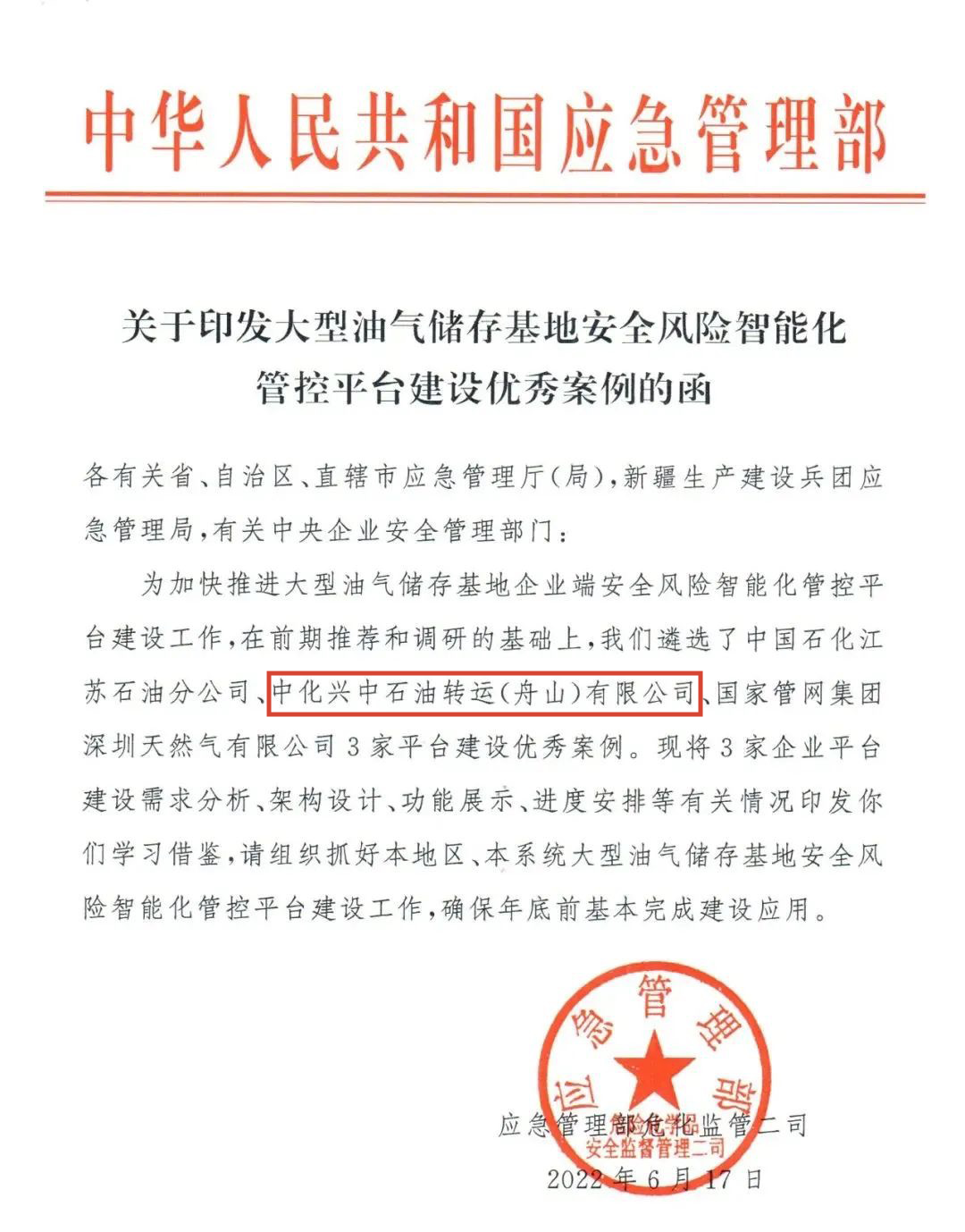 2021年5月,中化兴中入选应急管理部首批“工业互联网+危化安全生产”示范建设单位,经过一年的建设,2022年6月,中化兴中获评应急管理部大型油气储存基地安全风险智能化管控平台建设优秀案例,并被推广至我国各省级应急管理厅(局)和有关中央企业安全管理部门借鉴学习。