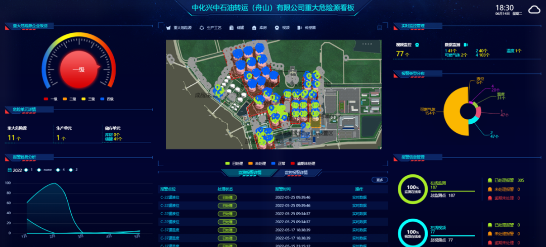 系统结合企业消防实际情况,将现场消防设备设施运行情况实时采集至云端数据库,建设智慧消防一体化管控平台,通过合理布局及可视化展示,将集成的数据进行可视化展示,实现岙山库区整体监控,同时配套中化物流港手机端,实现实时报警处置。对接中化物流港应急管理子系统,实现报警处置及后续处理的数据衔接。
