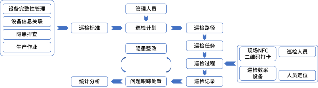 根据双重预防信息和设备完整性管理信息,生成安全智能巡检,实现巡检计划管理、巡检标准管理、巡检路径规划、巡检过程管理、问题跟踪处置及统计分析等功能。同时配合防爆型移动终端,实现现场定位、电子手签、人脸识别、隐患随手拍等功能。